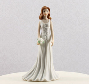 Wish this bride looked a little more like your bride? This bride figurine is available with a variety of custom hair colors including; blonde, brown, black, red, or silver grey. Hair color is hand-painted onto porcelain cake topper creating a one of kind custom piece that resembles you.