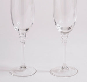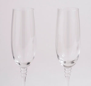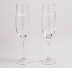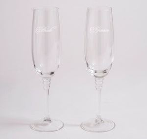 - Features: Glass flutes, laser engraved with Bride or Groom, twisted stem design